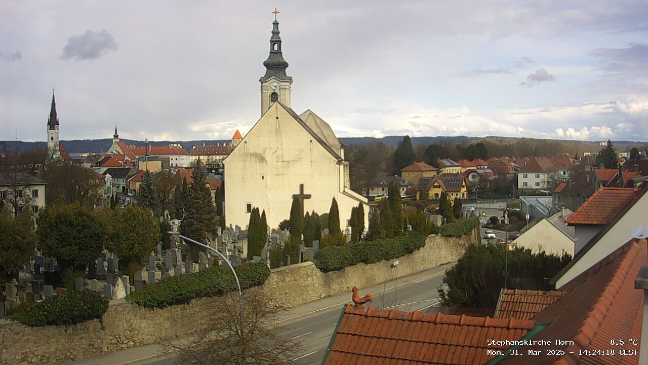 Die Kamera befindet sich im südlichen Teil von Horn und blickt Richtung Osten. Im Vordergrund ist die Prager Straße mit der Stephanskirche zu sehen. Links im Hintergrund befinden sich die im Zentrum der Stadt liegende Georgskirche, die Piaristenkirche und das Schloss.